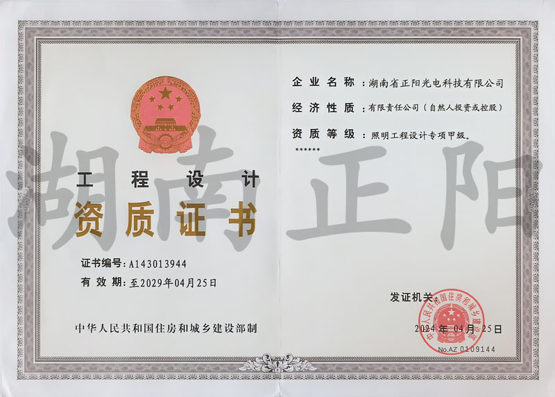 湖南省正陽光電科技有限公司是一家從事亮化工程及大型燈光藝術的設計、制作、安裝和維護于一體的專業(yè)化公司。公司資質齊全、管理嚴謹、技術先進、實力雄厚,取得了城市及道路照明工程專業(yè)承包壹級資質、照明工程設計專項甲級資質、機電工程施工總承包貳級資質、施工勞務等資質、國家高新技術企業(yè)、國家“重質量·守誠信”示范企業(yè)。